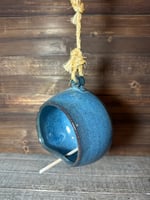 Wheel thrown then altered stoneware bird feeder. This one has a small dowel for a perch which can be replaced as needed by any stick or dowel that fits. The sisal rope should be checked for wear and replaced as needed. Bring inside in freezing weather to prevent damage/breaking. Approximately 5" wide.