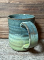 A combo of blues and greens that changes a little from every angle. Stoneware mug made from a dark chocolate colored clay. Holds approx 9oz