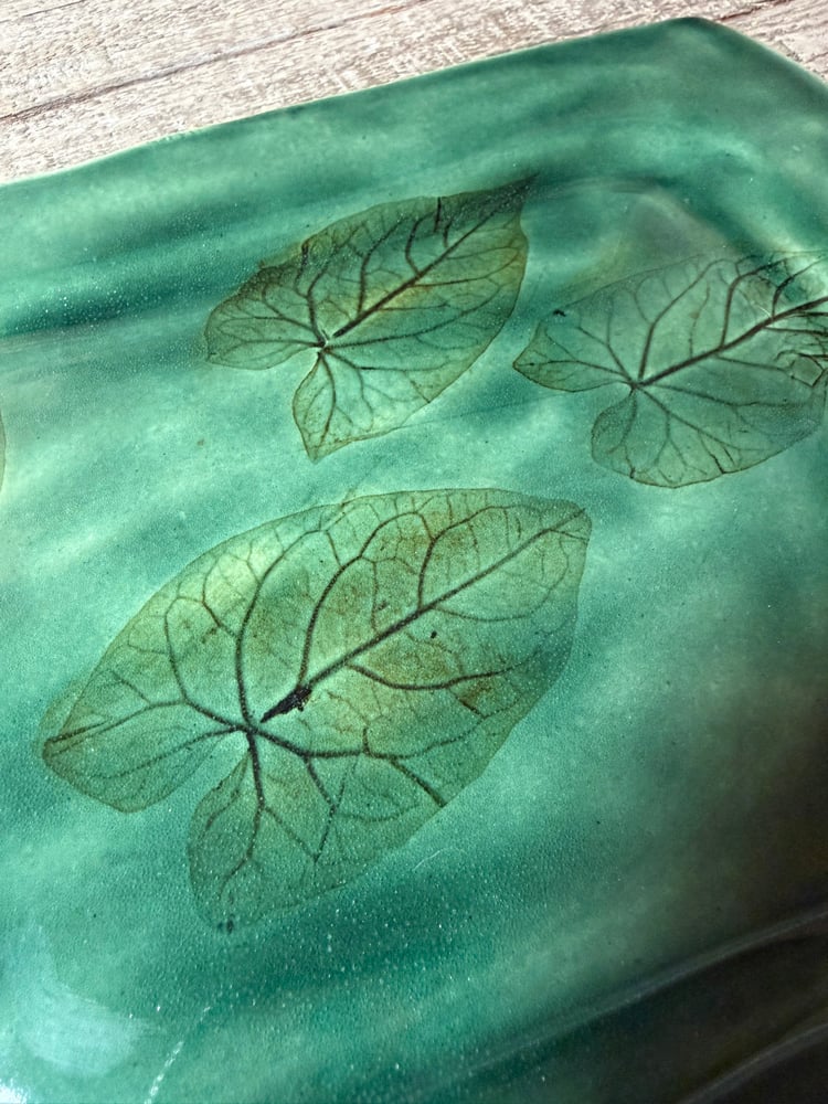 Hand built platter approximately 11.5” x 8”. Dishwasher safe stoneware. Imprints made with real leaves then stained with oxide stain to help them stand out under the celadon glaze.