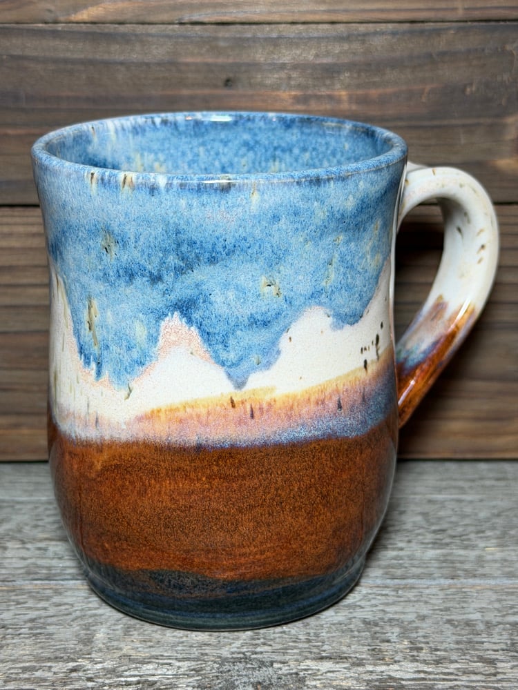 Wheel thrown stoneware mug- dishwasher and microwave safe. 4.25” tall. Holds approximately 14oz