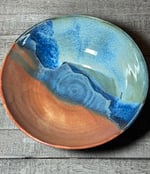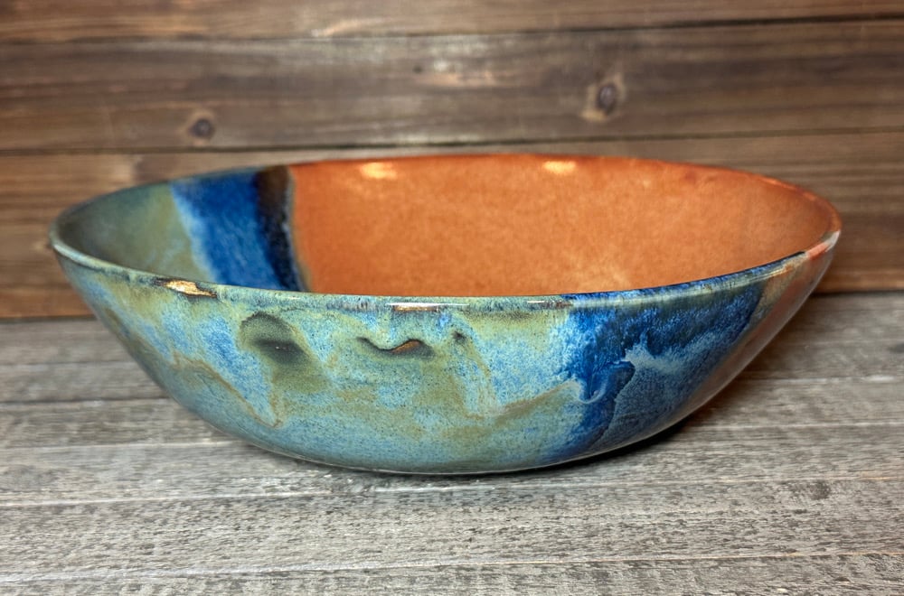 The bowl is just under 10” wide and 3” tall. Perfect for serving pasta or salads. Cone 6 stoneware tha is dishwasher safe.