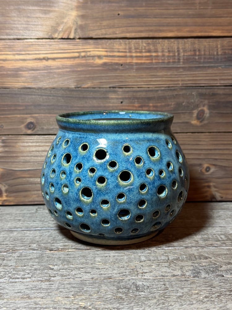 Wheel thrown stoneware pottery solar lantern. These make a great decorative piece for a patio table. It's a tedious process making them but I sure love the results! Clay shrinks through the drying and firing process so they have to be thrown to accommodate for this shrinkage so that the solar lid piece will fit a the end. Then there is the process of hand making each hole which present their own difficulty in glazing. Work- but worth the results! Bring inside before freezing weather to help prevent damage/breaking. Dishwasher safe (not the solar lid though!). Approximately 4.25” tall & 5.5” wide.